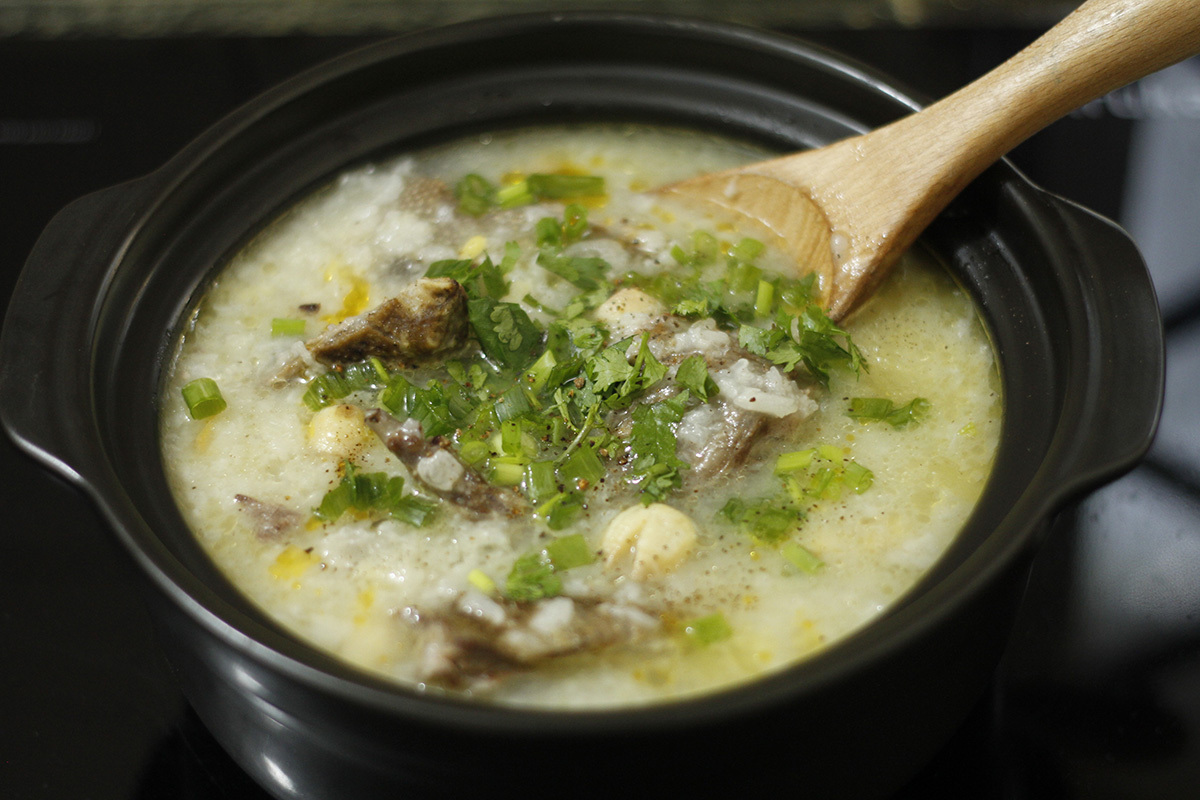 Khi ăn múc cháo ra tô, cho thêm hành lá, ngò, tiêu vào cho thơm.