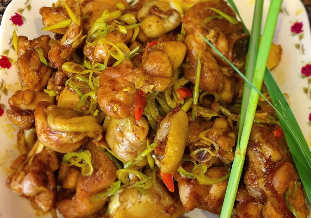 Gà rửa sạch, thái miếng nhỏ. Ướp với gừng, tỏi, ớt băm nhuyễn, đường, muối, mì chính, tiêu, 1 chút dầu ăn cho mềm thịt gà.