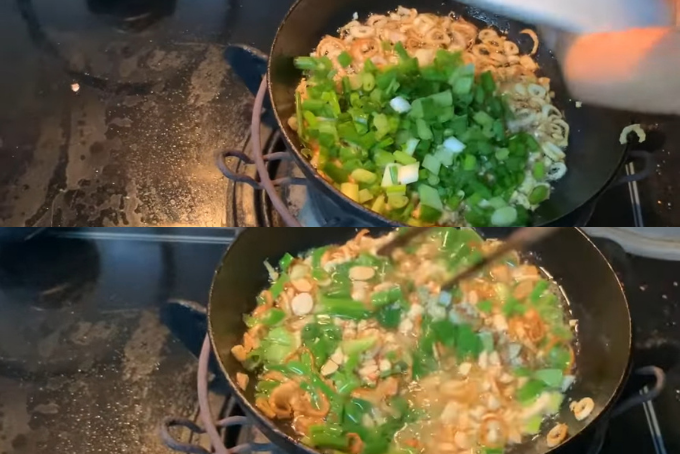 - Sau đó, cho hết phần hành lá đã xắt vào đảo đều với lửa nhỏ cho đến khi hành hơi săn lại và dậy mùi thơm, thêm một chút hạt nêm và muối rồi tắt bếp.